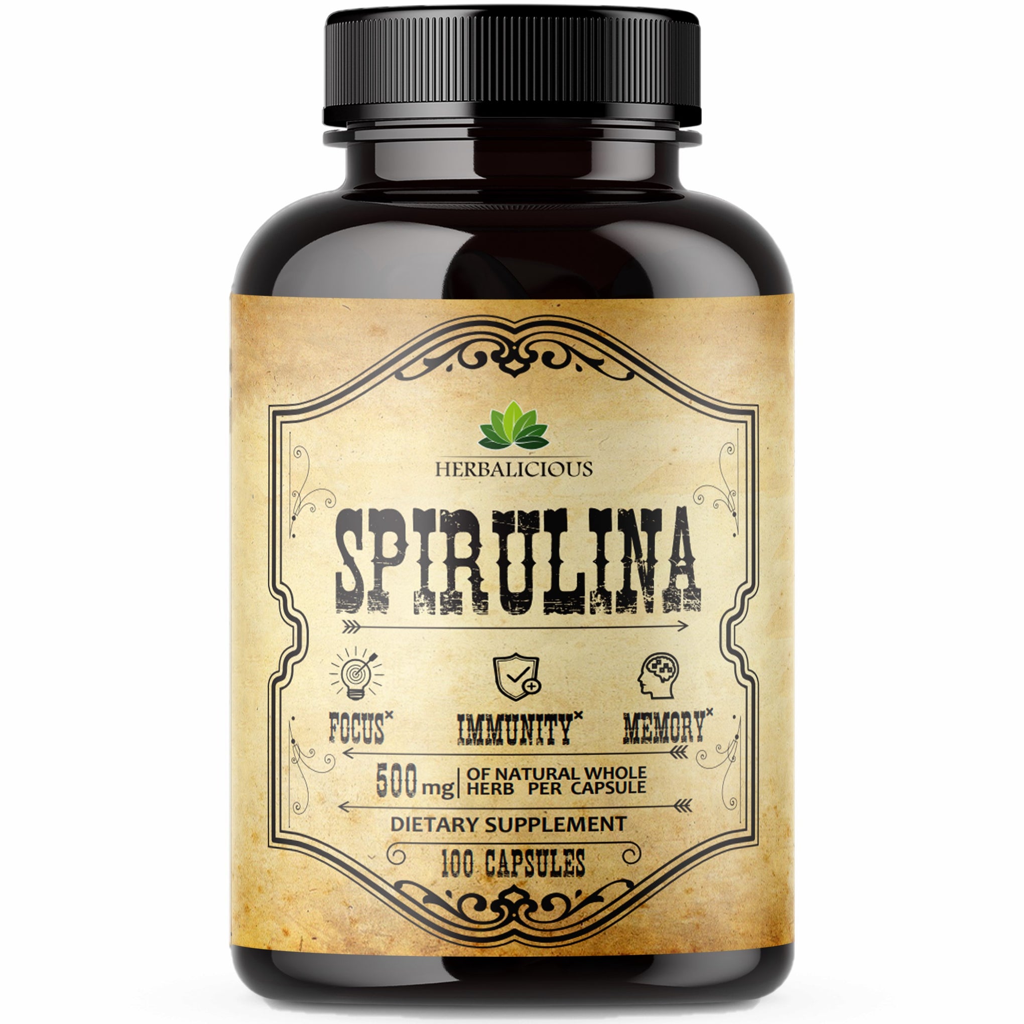 Spirulina 100 Capsules Blue Green Algae Extract with B Vitamins, Iron, Amino Acid&Antioxidants to Support Immune System Function